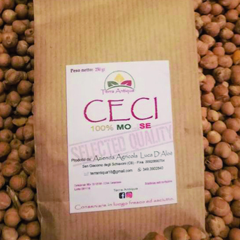 Descrizione: ceci secchi appartenenti alla produzione tipica molisana. Varietà caratterizzata da un legume piccolo e particolarmente gustoso.